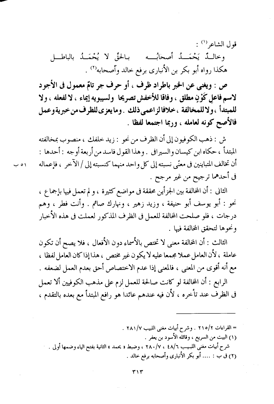 ش: ذهب الكوفيون إلى أن الظرف من نحو: زيد خلفك، منصوب بمخالفته المبتدأ، حكاه ابن كيسان والسيرافي. وهذا القول فاسد من أربعة أوجه: أحدها: أن تخالف المتباينين في معنًى نسبته إلى كل واحد منهما كنسبته إلى الآخر، فإعماله في أحدهما ترجيح من غير مرجح.