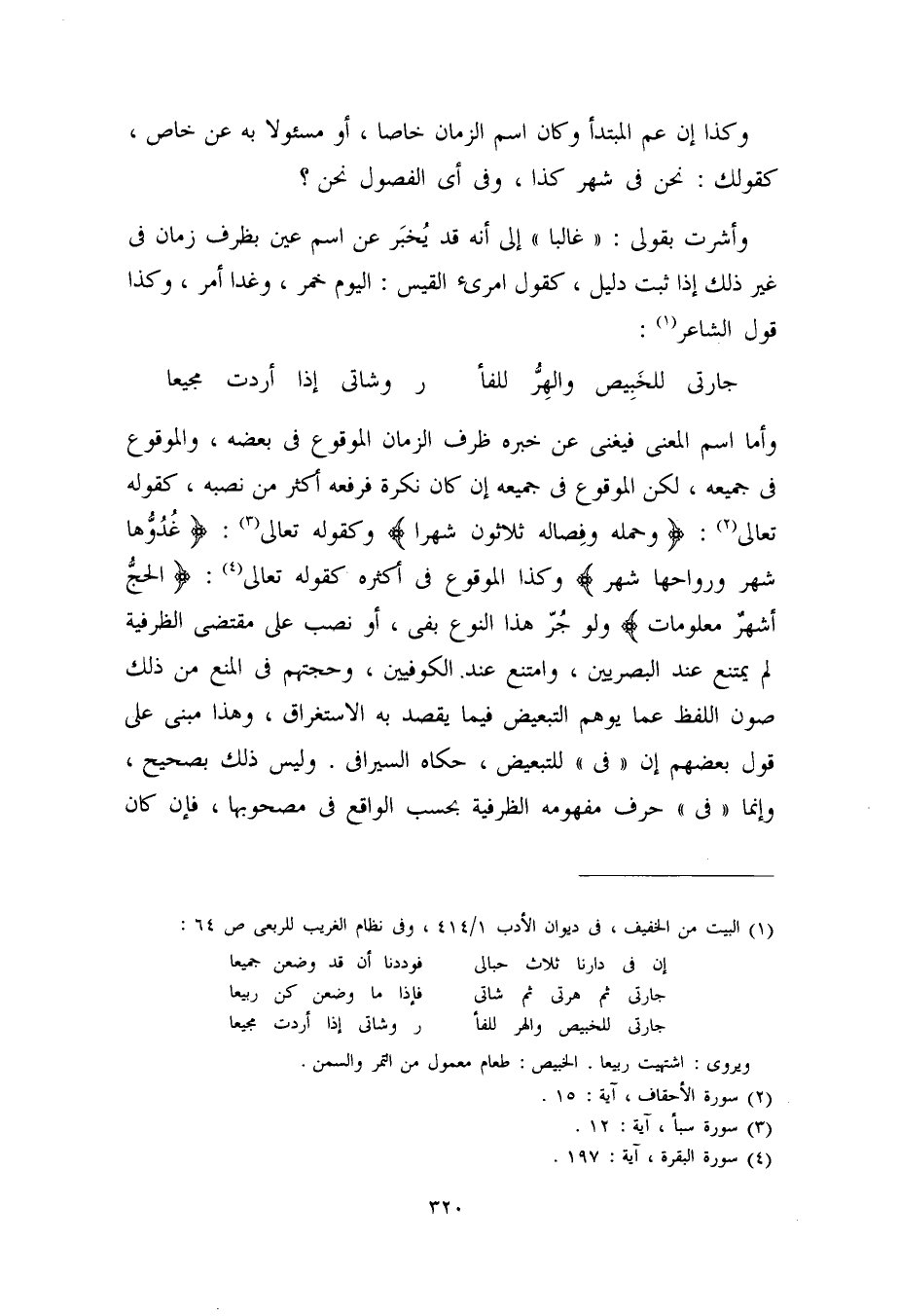 وأما اسم المعنى فيغني عن خبره ظرف الزمان الموقوع في بعضه، والموقوع في جميعه، لكن الموقوع في جميعه إن كان نكرة فرفعه أكثر من نصبه، كقوله تعالى: (وحمله وفِصاله ثلاثون شهرا) وكقوله تعالى: (غُدُوُّها شهر ورواحها شهر) وكذا الموقوع في أكثره كقوله تعالى: (الحجُّ أشهرٌ معلومات) ولو جُرّ هذا النوع بفي، أو نصب على مقتضى الظرفية لم يمتنع عند البصريين، وامتنع عند الكوفيين، وحجتهم في المنع من ذلك صون اللفظ عما يوهم التبعيض فيما يقصد به الاستغراق، وهذا مبني على قول بعضهم إن "في" للتبعيض، حكاه السيرافي. وليس ذلك بصحيح، وإنما "في" حرف مفهومه الظرفية بحسب الواقع في مصحوبها، فإن كان