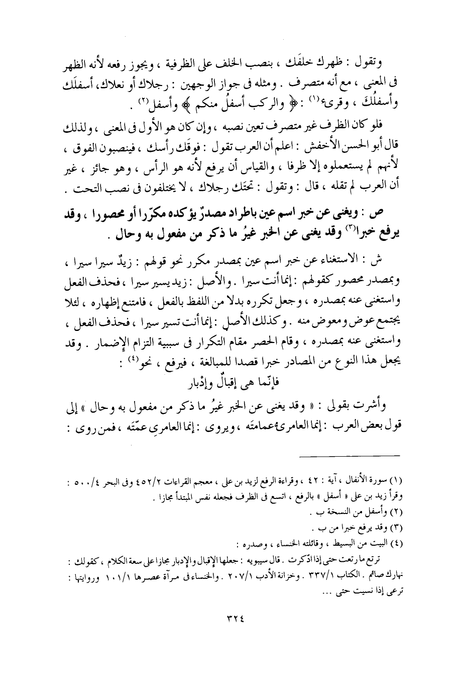 وتقول: ظهرك خلفَك، بنصب الخلف على الظرفية، ويجوز رفعه لأنه الظهر في المعنى، مع أنه متصرف. ومثله في جواز الوجهين: رجلاك أو نعلاك، أسفلَك وأسفلُك، وقرئ: (والركب أسفلُ منكم) وأسفل.