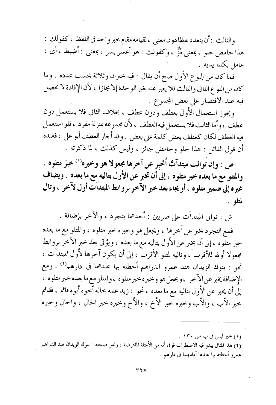 فمع التجرد يخبر عن آخرها، ويجعل هو وخبره خبر متلوه، والمتلو مع ما بعده خبر متلوه، إلى أن يخبر عن الأول بتاليه مع ما بعده، ويؤتى بعد خبر الآخر بروابط مجعولا أولها للأقرب، وتاليه لمتلو الأقرب، إلى أن يكون آخرها لأول المبتدآت، نحو: بنوك الزيدان هند عمرو الدراهم أحطته بها عندهما في دارهم. ومع الإضافة يخبر عن الآخر، ويجعل هو وخبره خبر متلوه، والمتلو مع ما بعده خبر متلوه، إلى أن يخبر عن الأول بتاليه مع ما بعده، نحو: زيد عمه خاله أخوه أبوه قائم، فقائم خبر الأب، والأب وخبره خبر الأخ، والأخ وخبره خبر الخال، والخال وخبره