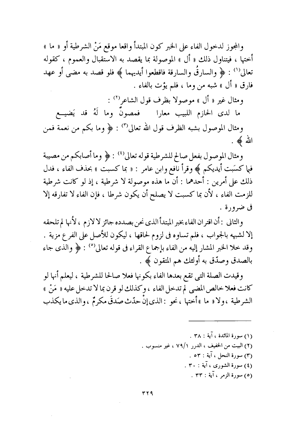والمجوز لدخول الفاء على الخبر كون المبتدأ واقعا موقع مَنْ الشرطية أو "ما" أختها، فيتناول ذلك "أل" الموصولة بما يقصد به الاستقبال والعموم، كقوله تعالى: (والسارقُ والسارقة فاقطعوا أيديهما) فلو قصد به مضى أو عهد فارق "أل" شبه من وما، فلم يؤت بالفاء.