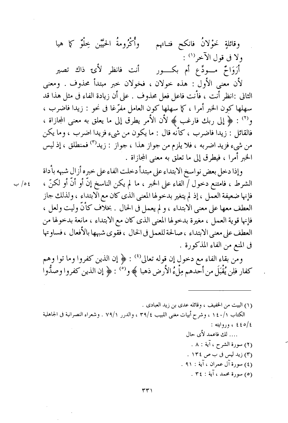 وإذا دخل بعض نواسخ الابتداء على مبتدأ دخلت الفاء على خبره أزال شبهه بأداة الشرط، فامتنع دخول الفاء على الخبر، ما لم يكن الناسخ إنّ وأنّ أو لكنّ، فإنها ضعيفة العمل، إذ لم يتغير بدخولها المعنى الذي كان مع الابتداء، ولذلك جاز العطف معها على معنى الابتداء، ولم يعمل في الحال. بخلاف كأنّ وليت ولعل، فإنها قوية العمل، مغيرة بدخولها المعنى الذي كان مع الابتداء، مانعة بدخولها من العطف على معنى الابتداء، صالحة للعمل في الحال، فقوى شبهها بالأفعال، فساوتها في المنع من الفاء المذكورة.