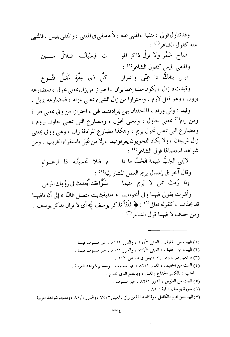 وقيد: وَنى ورام، الملحقتان بهن بمرادفتهما لهن، احترازا من ونى بمعنى فتر، ومن رام بمعنى حاول، وبمعنى تحوّل، ومضارع التي بمعنى حاول يروم، ومضارع التي بمعنى تحول يريم، وهكذا مضارع المرادفة زال، وهي وونى بمعنى زال غريبتان، ولا يكاد النحويون يعرفونهما، إلا من عُنِيَ باستقراء الغريب. ومن شواهد استعمالها قول الشاعر: