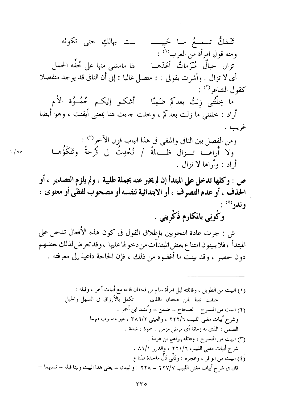 ص: وكلها تدخل على المبتدأ إن لم يخبر عنه بجملة طلبية، ولم يلزم التصدير، أو الحذف، أو عدم التصرف، أو الابتدائية لنفسه أو مصحوب لفظي أو معنوي، وندر: وكُوني بالمكارم ذَكِّرِيني.