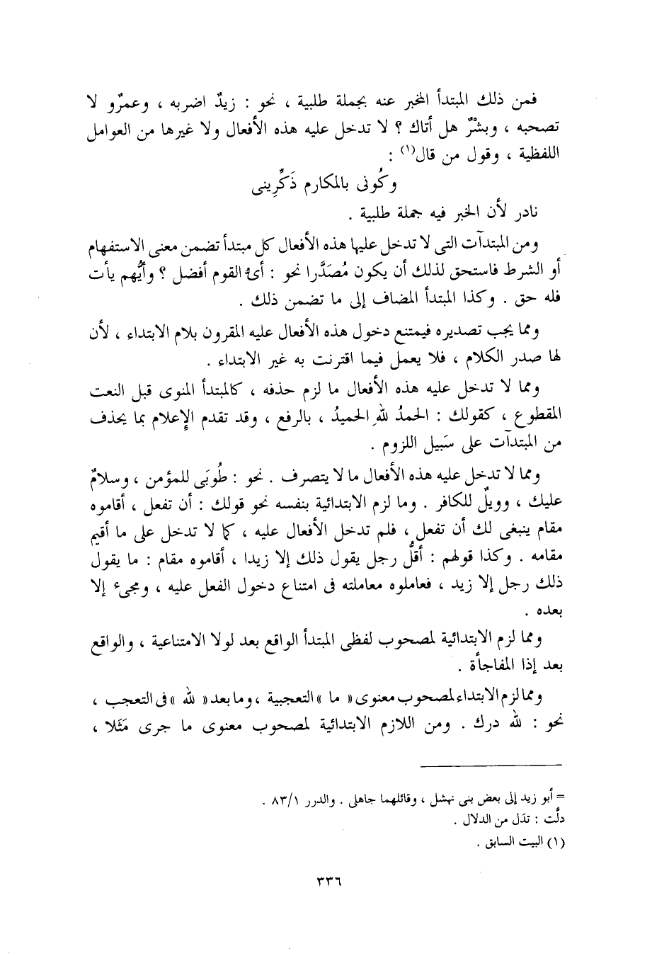 فمن ذلك المبتدأ المخبر عنه بجملة طلبية، نحو: زيدٌ اضربه، وعمرٌو لا تصحبه، وبشْرٌ هل أتاك؟ لا تدخل عليه هذه الأفعال ولا غيرها من العوامل اللفظية، وقول من قال: وكُوني بالمكارم ذَكِّريني