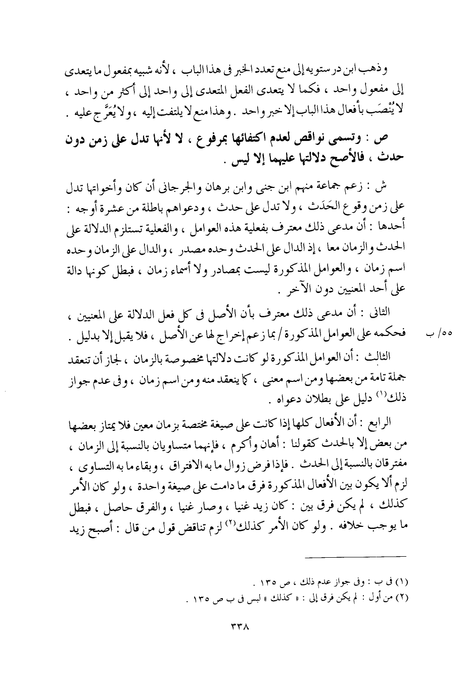 الرابع: أن الأفعال كلها إذا كانت على صيغة مختصة بزمان معين فلا يمتاز بعضها من بعض إلا بالحدث كقولنا: أهان وأكرم، فإنهما متساويان بالنسبة إلى الزمان، مفترقان بالنسبة إلى الحدث. فإذا فرض زوال ما به الافتراق، وبقاء ما به التساوي، لزم ألا يكون بين الأفعال المذكورة فرق ما دامت على صيغة واحدة، ولو كان الأمر كذلك، لم يكن فرق بين: كان زيد غنيا، وصار غنيا، والفرق حاصل، فبطل ما يوجب خلافه. ولو كان الأمر كذلك لزم تناقض قول من قال: أصبح زيد