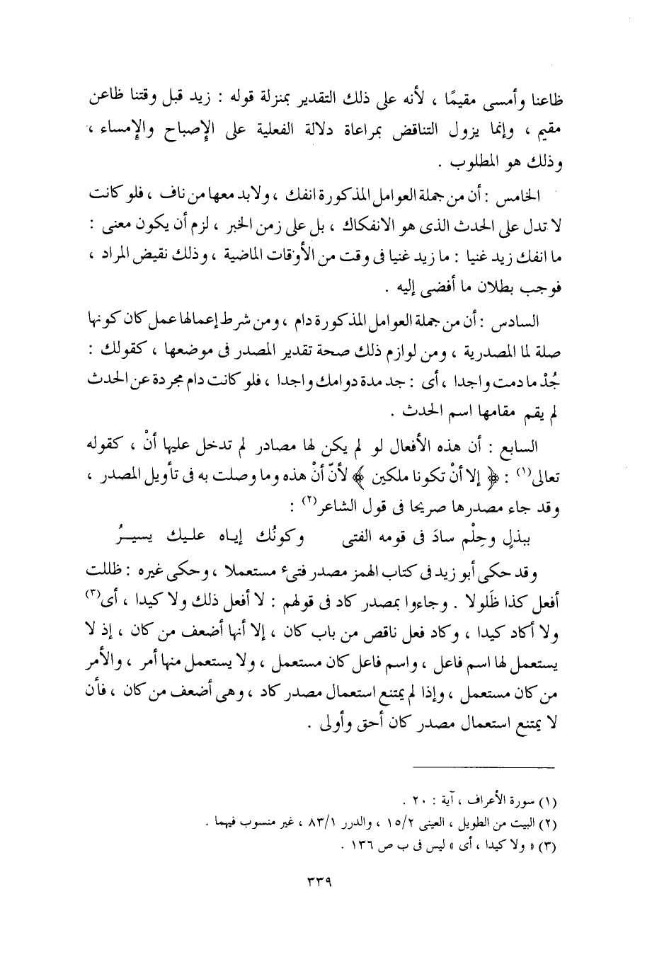 الخامس: أن من جملة العوامل المذكورة انفك، ولا بد معها من ناف، فلو كانت لا تدل على الحدث الذي هو الانفكاك، بل على زمن الخبر، لزم أن يكون معنى: ما انفك زيد غنيا: ما زيد غنيا في وقت من الأوقات الماضية، وذلك نقيض المراد، فوجب بطلان ما أفضى إليه.