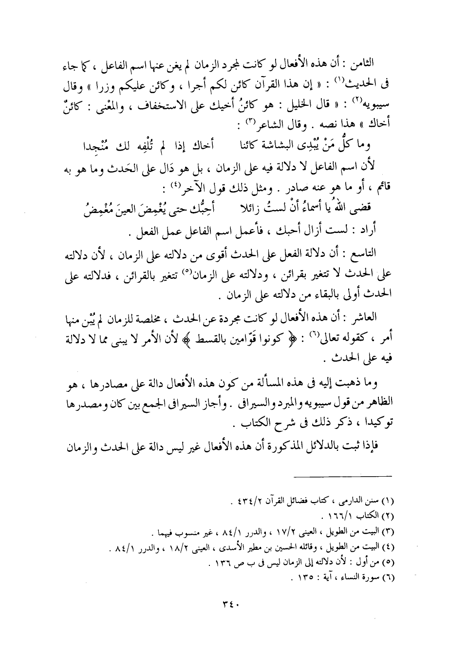 الثامن: أن هذه الأفعال لو كانت لمجرد الزمان لم يغن عنها اسم الفاعل، كما جاء في الحديث: "إن هذا القرآن كائن لكم أجرا، وكائن عليكم وزرا" وقال سيبويه: "قال الخليل: هو كائنُ أخيك على الاستخفاف، والمعنى: كائنٌ أخاك" هذا نصه. وقال الشاعر: