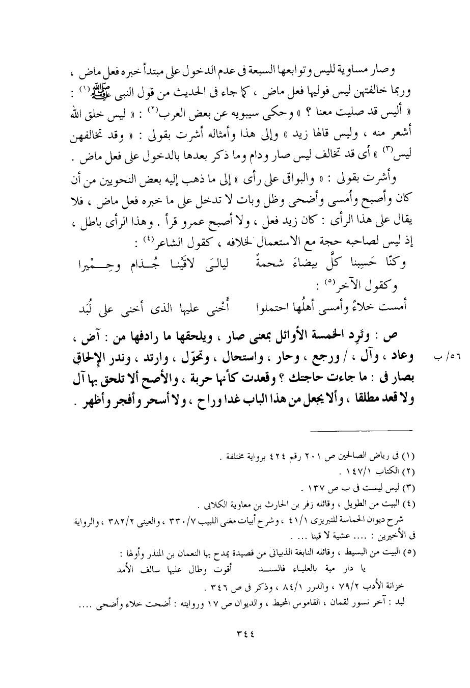 وصار مساوية لليس وتوابعها السبعة في عدم الدخول على مبتدأ خبره فعل ماض، وربما خالفتهن ليس فوليها فعل ماض، كما جاء في الحديث من قول النبي صلى الله عليه وسلم: "أليس قد صليت معنا؟ " وحكى سيبويه عن بعض العرب: "ليس خلق الله أشعر منه، وليس قالها زيد" وإلى هذا وأمثاله أشرت بقولي: "وقد تخالفهن ليس" أي قد تخالف ليس صار ودام وما ذكر بعدها بالدخول على فعل ماض.
