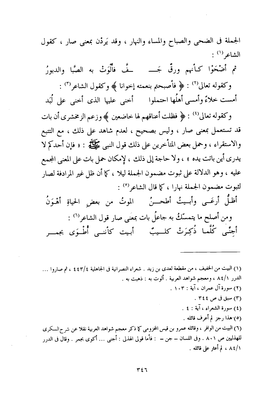وكقوله تعالى: (فظلت أعناقهم لها خاضعين) وزعم الزمخشري أن بات قد تستعمل بمعنى صار، وليس بصحيح، لعدم شاهد على ذلك، مع التتبع والاستقراء، وحمل بعض المتأخرين على ذلك قول النبي صلى الله عليه وسلم: "فإن أحدكم لا يدري أين باتت يده" ولا حاجة إلى ذلك، لإمكان حمل بات على المعنى المجمع عليه، وهو الدلالة على ثبوت مضمون الجملة ليلا، كما أن ظل غير المرادفة لصار لثبوت مضمون الجملة نهارا، كما قال الشاعر: