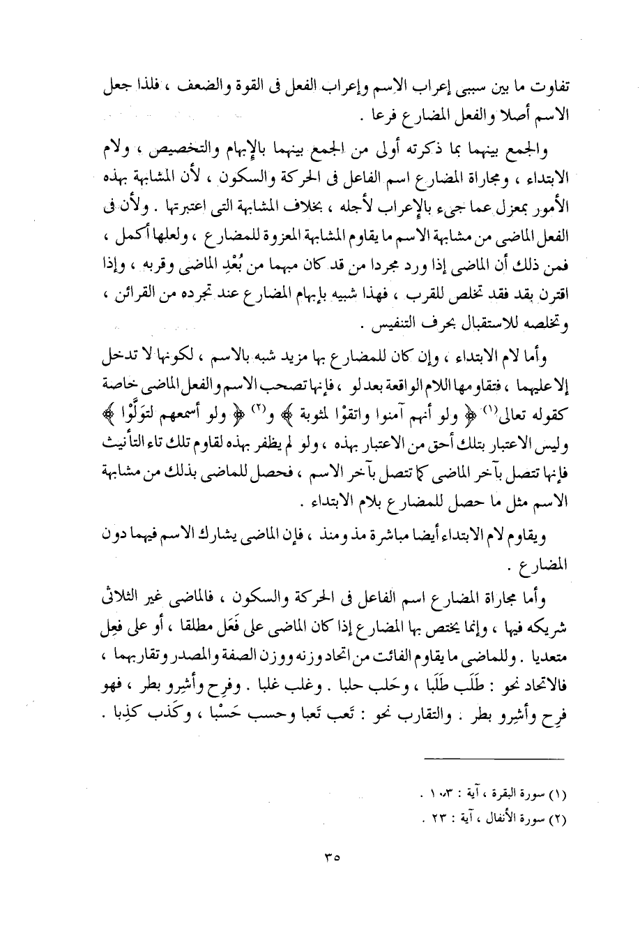 وأما مجاراة المضارع اسم الفاعل في الحركة والسكون، فالماضي غير الثلاثي شريكه فيها، وإنما يختص بها المضارع إذا كان الماضي على فَعَل مطلقا، أو على فَعِل متعديا. وللماضي ما يقاوم الفائت من اتحاد وزنه ووزن الصفة والمصدر وتقاربهما، فالاتحاد نحو: طَلَبَ طَلَبا، وحَلب حلبا، وغلب غلبا، وفرِح وأشِر وبطر، فهو فرح وأشِر وبطر، والتقارب نحو: تَعب تَعبا وحسب حَسْبا، وكذب كذِبا.