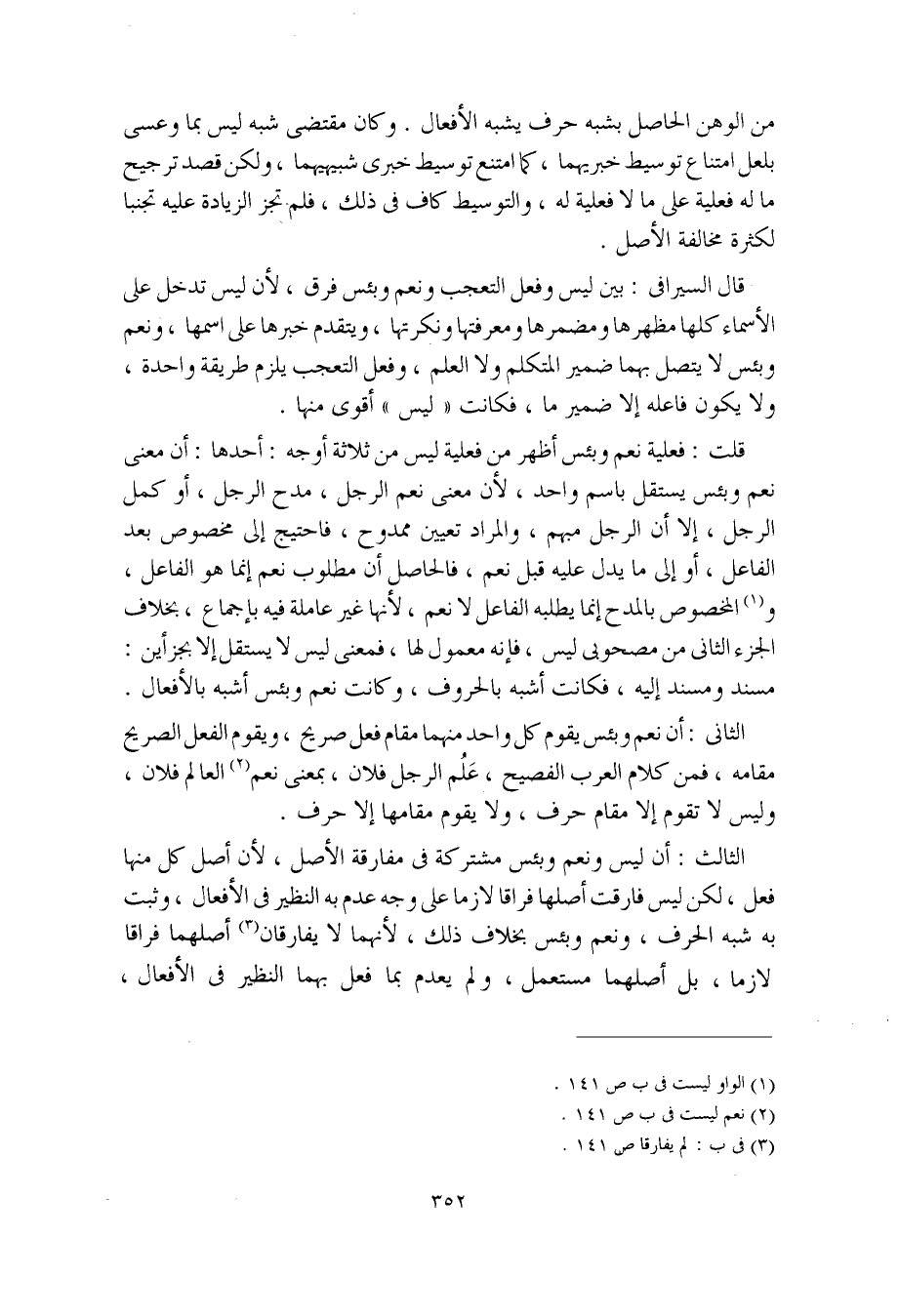 الثالث: أن ليس ونعم وبئس مشتركة في مفارقة الأصل، لأن أصل كل منها فعل، لكن لسي فارقت أصلها فراقا لازما على وجه عدم به النظير في الأفعال، وثبت به شبه الحرف، ونعم وبئس بخلاف ذلك، لأنهما لا يفارقان أصلهما فراقا لازما، بل أصلهما مستعمل، ولم يعدم بما فعل بهما النظير في الأفعال،