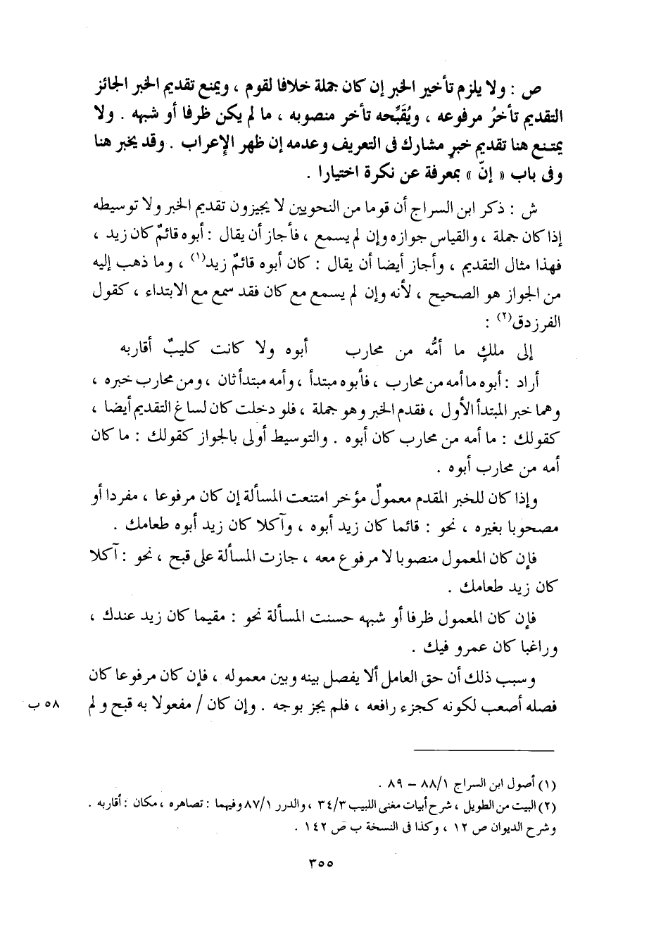 ص: ولا يلزم تأخير الخبر إن كان جملة خلافا لقوم، ويمنع تقديم الخبر الجائز التقديم تأخرُ مرفوعه، ويُقَبِّحه تأخر منصوبه، ما لم يكن ظرفا أو شبهه. ولا يمتنع هنا تقديم خبرٍ مشارك في التعريف وعدمه إن ظهر الإعراب. وقد يخبر هنا وفي باب "إنّ" بمعرفة عن نكرة اختيارا.