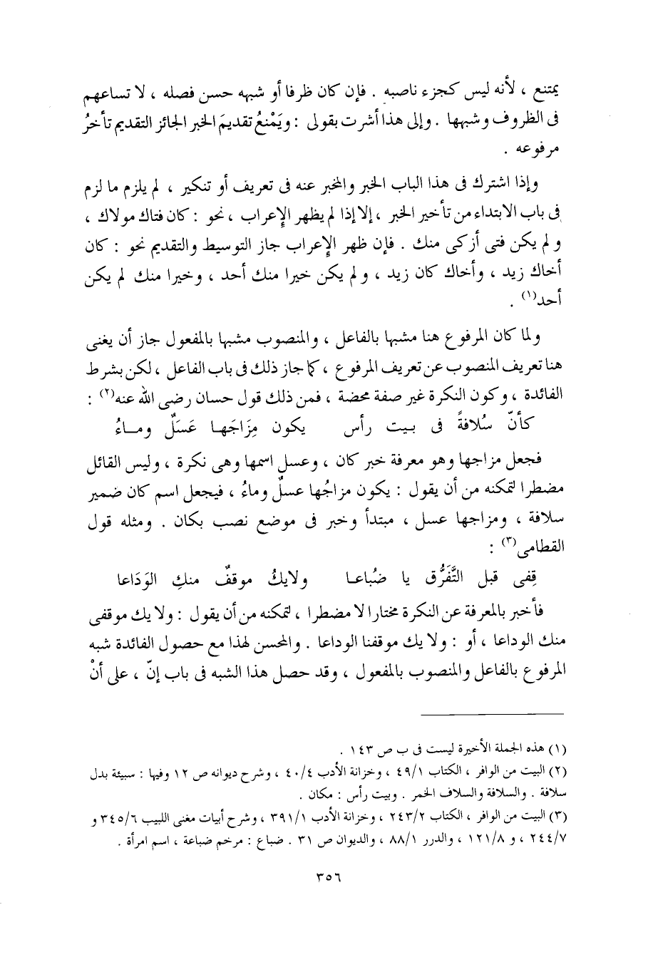 فأخبر بالمعرفة عن النكرة مختارا لا مضطرا، لتمكنه من أن يقول: ولا يك موقفي منك الوداعا، أو: ولا يك موقفنا الوداعا. والمحسن لهذا مع حصول الفائدة شبه المرفوع بالفاعل والمنصوب بالمفعول، وقد حصل هذا الشبه في باب إنّ، على أنْ