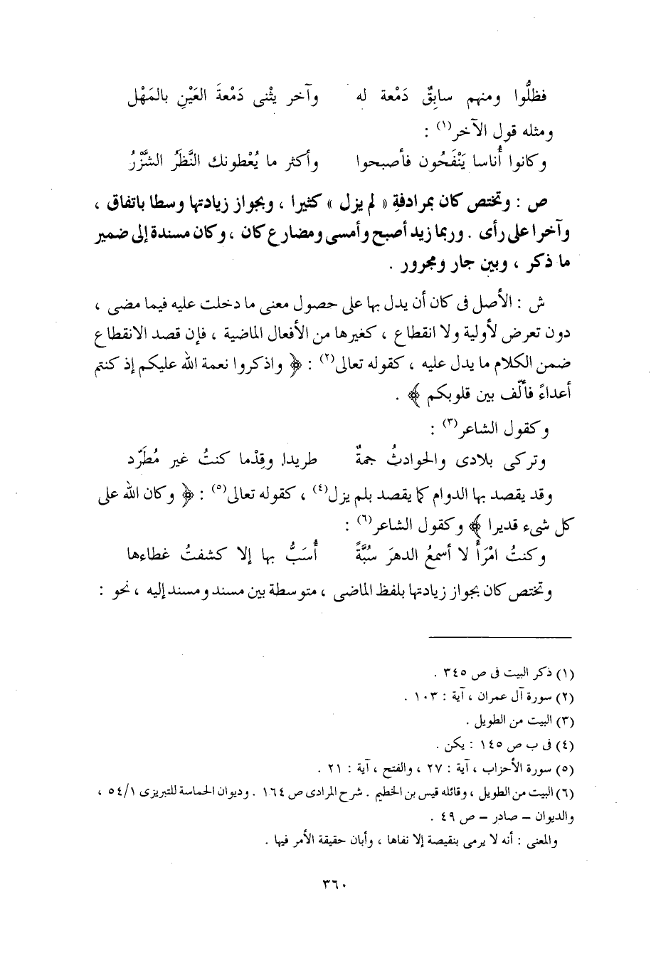 ص: وتختص كان بمرادفة "لم يزل" كثيرا، وبجواز زيادتها وسطا باتفاق، وآخرا على رأي. وربما زيد أصبح وأمسى ومضارع كان، وكان مسندة إلى ضمير ما ذكر، وبين جار ومجرور.