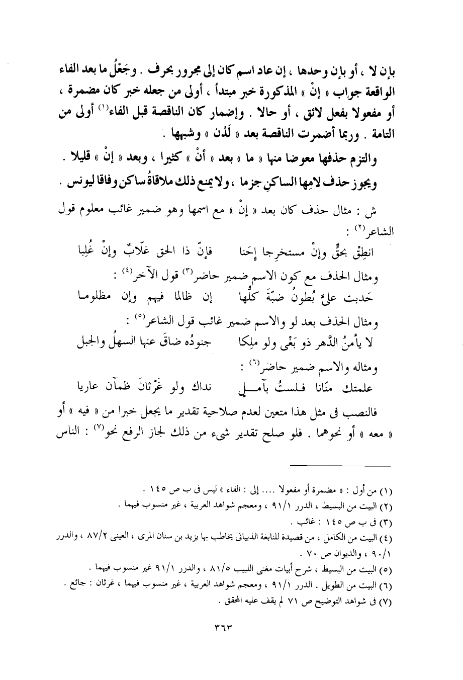 ش: مثال حذف كان بعد "إنْ" مع اسمها وهو ضمير غائب معلوم قول الشاعر: