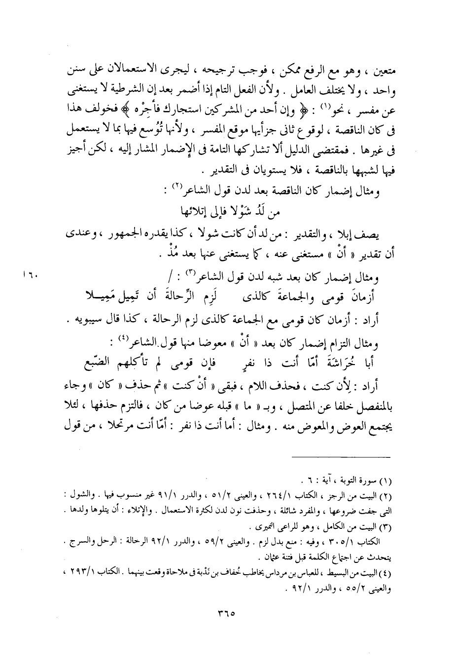 متعين، وهو مع الرفع ممكن، فوجب ترجيحه، ليجرى الاستعمالان على سنن واحد، ولا يختلف العامل. ولأن الفعل التام إذا أضمر بعد إن الشرطية لا يستغنى عن مفسر، نحو: (وإن أحد من المشركين استجارك فأجِرْه) فخولف هذا في كان الناقصة، لوقوع ثاني جزأيها موقع المفسر، ولأنها تُوسع فيها بما لا يستعمل في غيرها، فمقتضى الدليل ألا تشاركها التامة في الإضمار المشار إليه، لكن أجيز فيها لشبهها بالناقصة، فلا يستويان في التقدير.