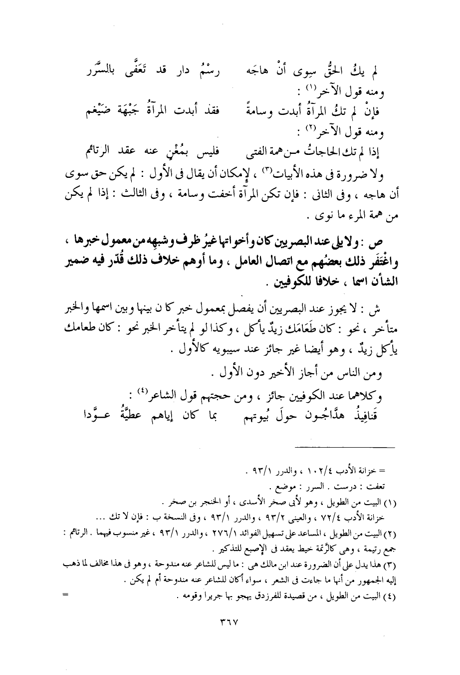 ولا ضرورة في هذه الأبيات، لإمكان أن يقال في الأول: لم يكن حق سوى أن هاجه، وفي الثاني: فإن تكن المرآة أخفت وسامةن وفي الثالث: إذا لم يكن من همة المرء ما نوى.