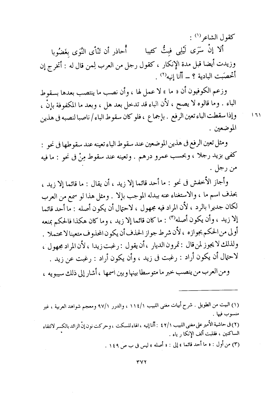 ومثل تعين الرفع في هذين الموضعين عند سقوط الباء تعينه عند سقوطها في نحو: كفى بزيد رجلا، وبحسب عمرو درهم. وتعينه عند سقوط مِنْ في نحو: ما فيه من رجل.