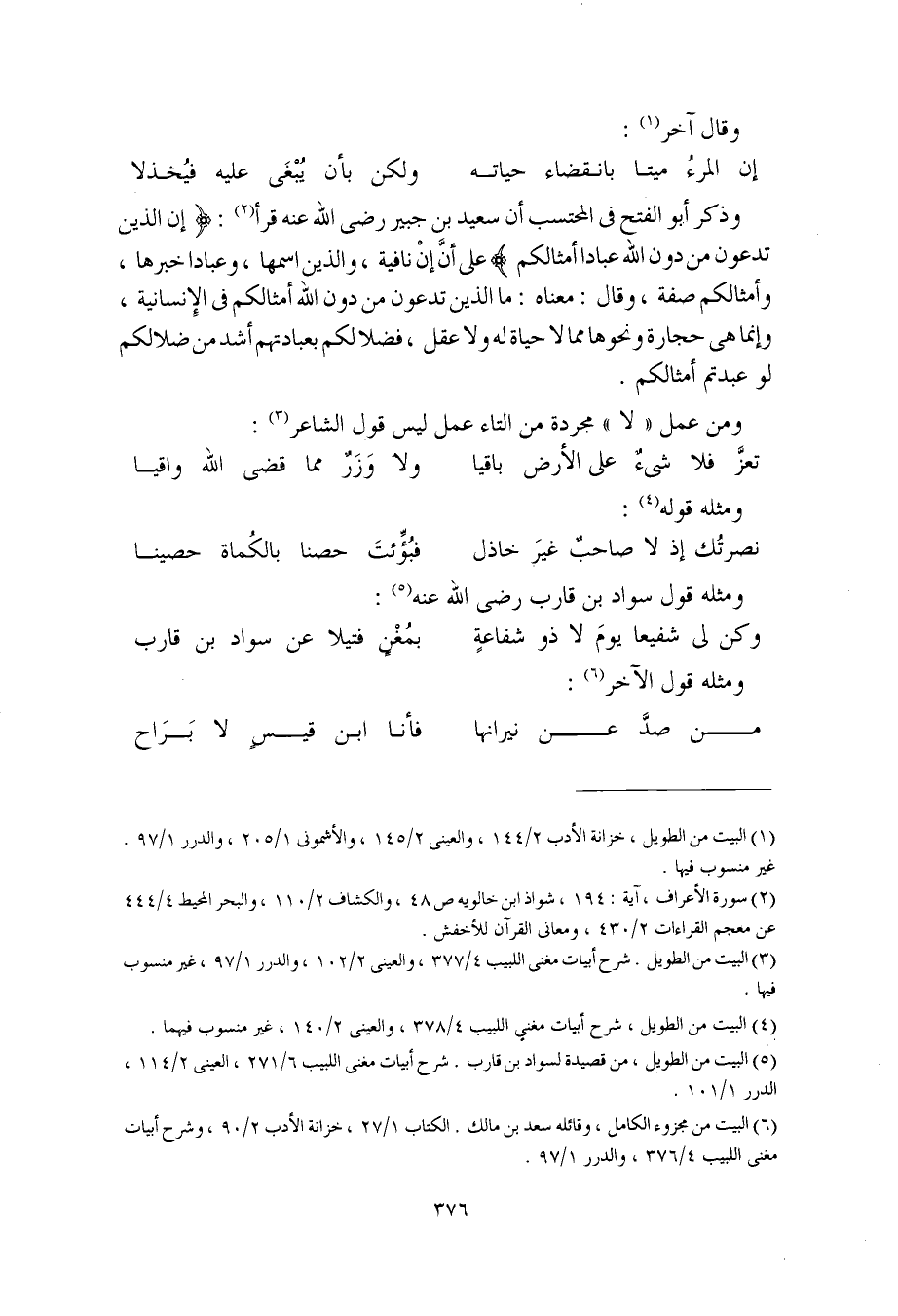 وذكر أبو الفتح في المحتسب أن سعيد بن جبير رضي الله عنه قرأ: (إن الذين تدعون من دون الله عباد أمثالكم) على أنَّ إنْ نافية، والذين اسمها، وعبادا خبرها، وأمثالكم صفة، وقال: معناه: ما الذين تدعون من دون الله أمثالكم في الإنسانية، وإنما هي حجارة ونحوها مما لا حياة له ولا عقل، فضلا لكم بعبادتهم أشد من ضلالكم لو عبدتم أمثالكم.