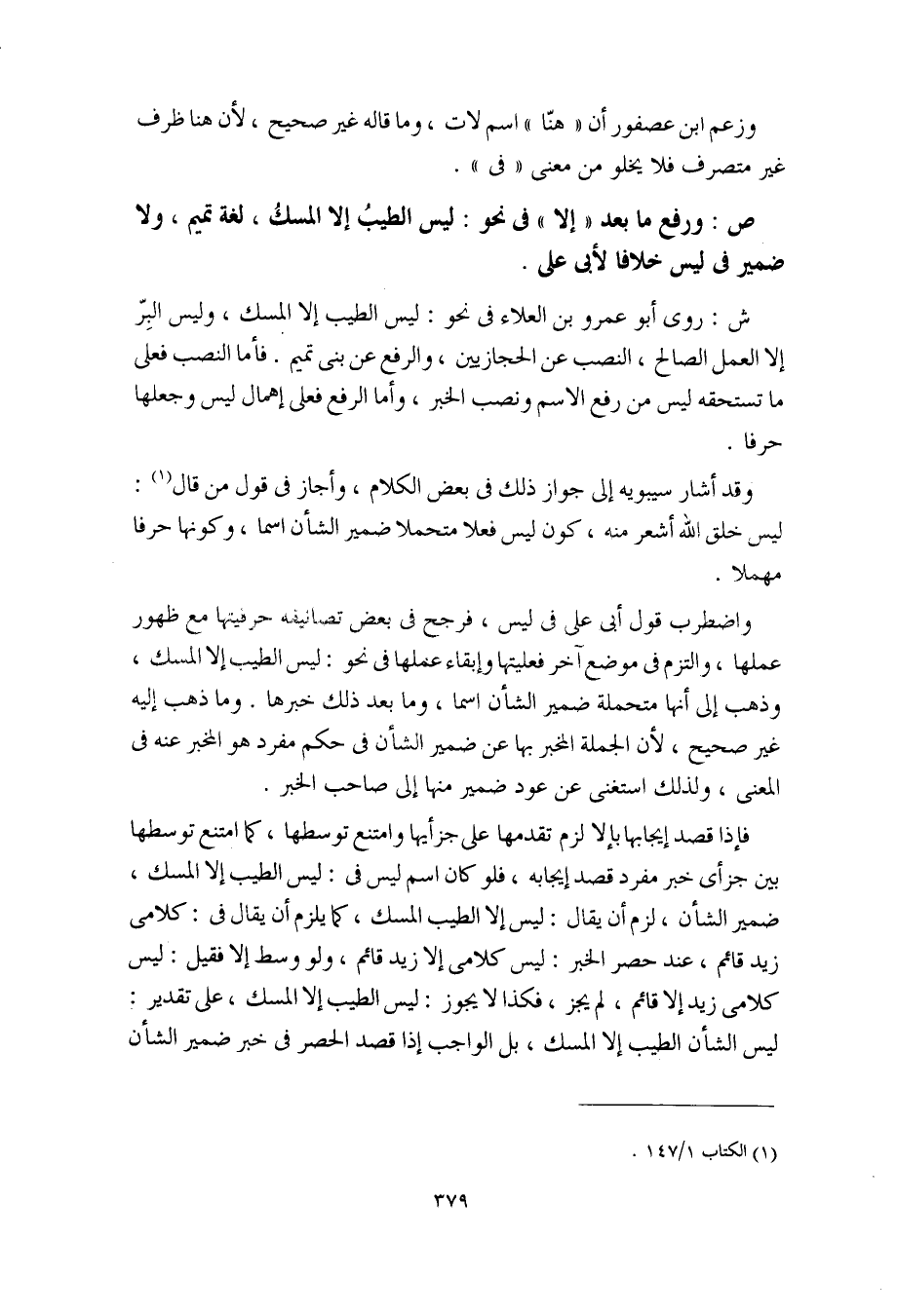 واضطرب قول أبي علي في ليس، فرجح في بعض تصانيفها حرفيتها مع ظهور عملها، والتزم في موضع آخر فعليتها وإبقاء عملها في نحو: ليس الطيب إلا المسك، وذهب إلى أنها متحملة ضمير الشأن اسما، وما بعد ذلك خبرها. وما ذهب إليه غير صحيح، لأن الجملة المخبر بها عن ضمير الشأن في حكم مفرد هو المخبر عنه في المعنى، ولذلك استغنى عن عود ضمير منها إلى صاحب الخبر.