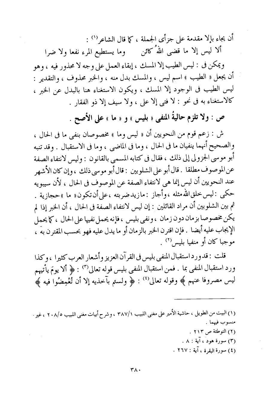 ش: وزعم قوم من النحويين أن "ليس وما" مخصوصان بنفي ما في الحال، والصحيح أنهما ينفيان ما في الحال، وما في الماضي، وما في الاستقبال. وقد تنبه أبو موسى الجزولي إلى ذلك، فقال في كتابه المسمى بالقانون: وليس لانتفاء الصفة عن الموصوف مطلقا. قال أبو علي الشلوبين: قال أبو موسى ذلك، وإن كان الأضهر عند النحويين أن ليس إنما هي لانتفاء الصفة عن الموصوف في الحال، لأن سيبويه حكى: ليس خلق الله مثله، وأجاز: ما زيد ضربته، على أن تكون "ما" حجازية.