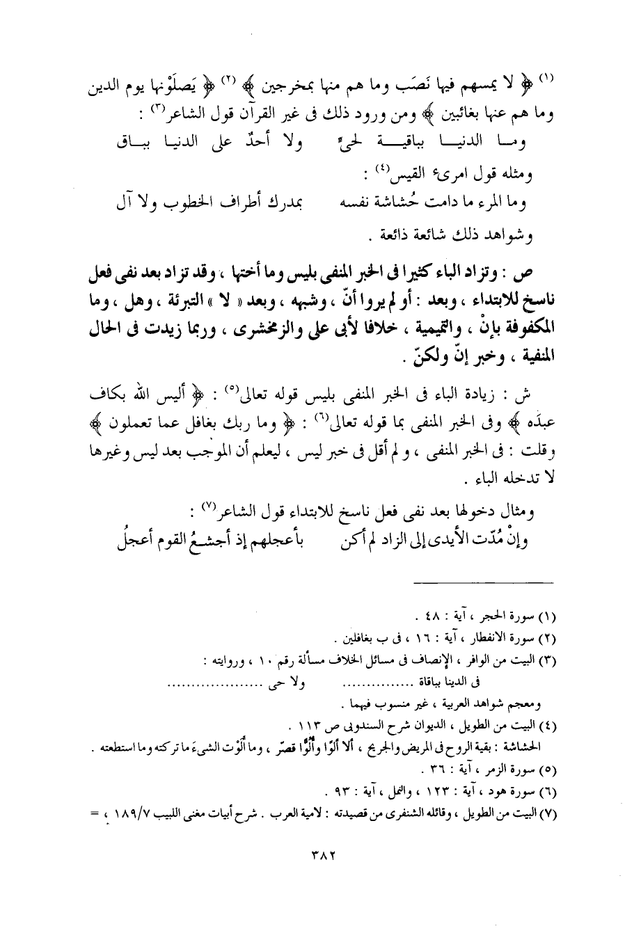 ش: زيادة الباء في الخبر المنفي بليس قوله تعالى: (أليس الله بكاف عبدَه) وفي الخبر المنفي بما قوله تعالى: (وما ربك بغافل عما تعملون) وقلت: في الخبر المنفي، ولم أقل في خبر ليس، ليعلم أن الموجب بعد ليس وغيرها لا تدخله الباء.