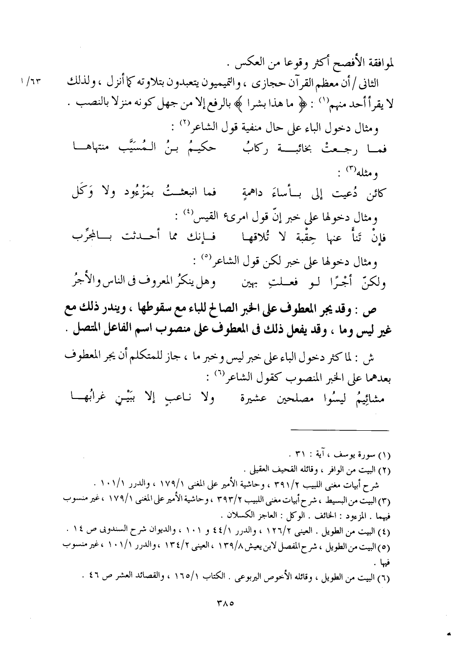 الثاني أن معظم القرآن حجازي، والتميميون يتعبدون بتلاوته كما أنزل، ولذلك لا يقرأ أحد منهم: (ما هذا بشرا) بالرفع إلا من جهل كونه منزلا بالنصب.
