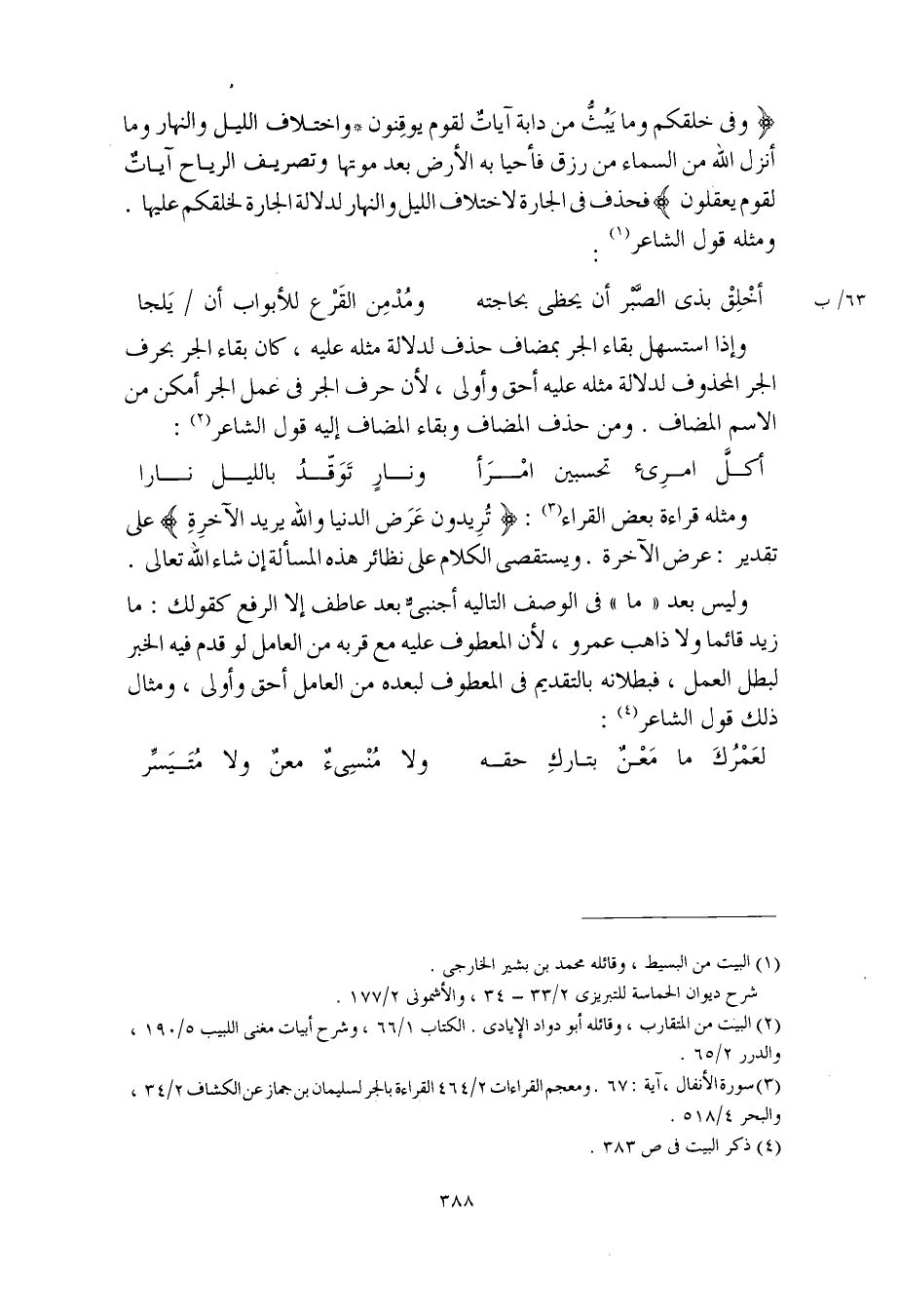 (وفي خلقكم وما يَبُثُّ من دابة آياتٌ لقوم يوقِنون * واختلاف الليل والنهار وما أنزل الله من السماء من رزق فأحيا به الأرض بعد موتها وتصريف الرياح آياتٌ لقوم يعقلون) فحذف في الجارة لاختلاف الليل والنهار لدلالة الجارة لخلقكم عليها. ومثله قول الشاعر: