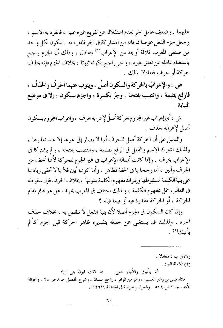 ش: أي إعراب غير المجزوم بحركة أصلٌ لإعرابه بحرف، وإعراب المجزوم بسكون أصل لإعرابه بحذف.