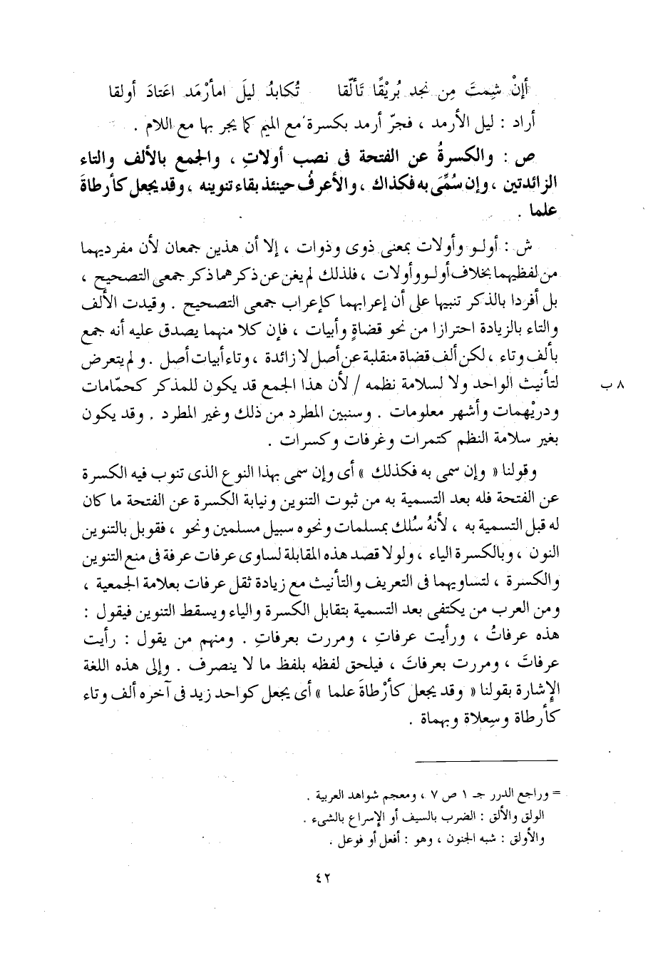 ش: أولو وأولات بمعنى ذوي وذوات، إلا أن هذين جمعان لأن مفرديهما من لفظيهما بخلاف أولو وأولات، فلذلك لم يغن عن ذكرهما ذكر جمعي التصحيح، بل أفردا بالذكر تنبيها على أن إعرابهما كإعراب جمعي التصحيح، وقيدت الألف والتاء بالزيادة احترازا من نحو قضاةٍ وأبيات، فإن كلا منهما يصدق عليه أنه جمع بألف وتاء، لكن ألف قضاة منقلبة عن أصل لا زائدة، وتاء أبيات أصل. ولم يتعرض لتأنيث الواحد ولا لسلامة نظمه لأن هذا الجمع قد يكون للمذكر كحمّامات ودريْهمات وأشهر معلومات. وسنبين المطرد من ذلك وغير المطرد، وقد يكون بغير سلامة النظم كتمرات وغرفات وكسرات.
