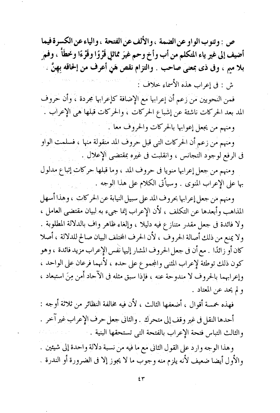 ومنهم من جعل إعرابها بحروف المد على سبيل النيابة عن الحركات، وهذا أسهل المذاهب وأبعدها عن التكلف، لأن الإعراب إنما جيء به لبيان مقتضى العامل، ولا فائدة في جعل مقدر متنازع فيه دليلا، وإلغاء ظاهر واف بالدلالة المطلوبة.