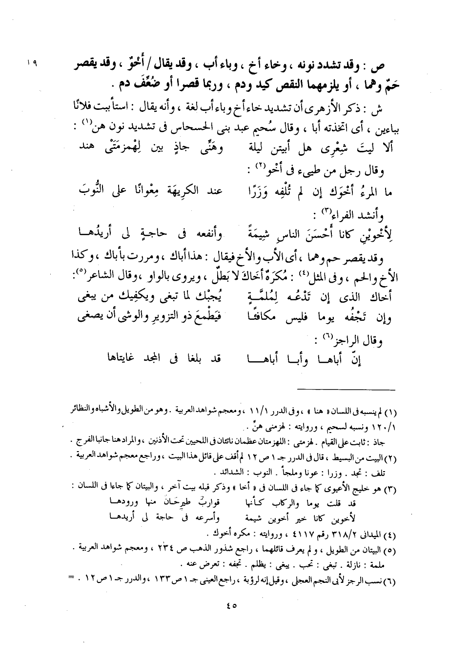 ص: وقد تشدد نونه، وخاء أخ، وباء أب، وقد يقال أخْوٌ، وقد يقصر حَمٌ وهما، أو يلزمهما النقص كيد ودم، وربما قصرا أو ضُعِّفَ دم.