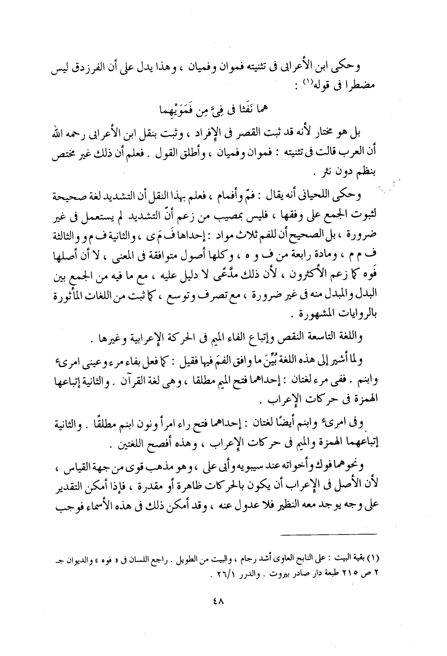 وحكى ابن الأعرابي في تثنيته فموان وفميان، وهذا يدل على أن الفرزدق ليس مضطرا في قوله: