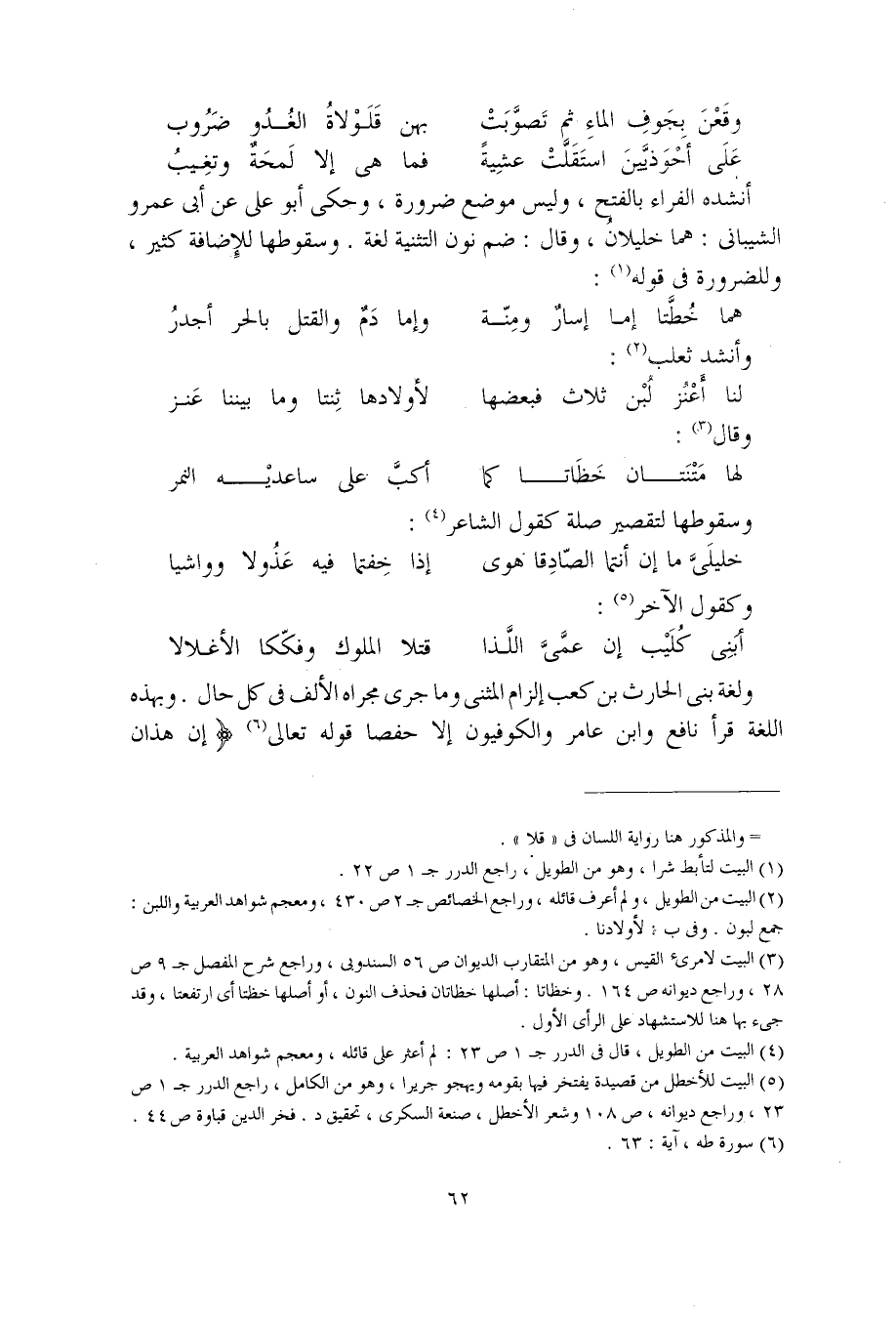 ولغة بني الحارث بن كعب إلزام المثنى وما جرى مجراه الألف في كل حال. وبهذه اللغة قرأ نافع وابن عامر والكوفيون إلا حفصا قوله تعالى (إن هذان