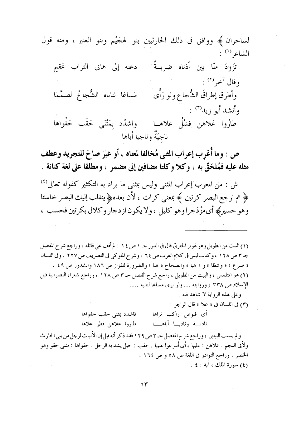ش: من المعرب إعراب المثنى وليس بمثنى ما يراد به التكثير كقوله تعالى (ثم ارجع البصر كرتين) بمعنى كرات، لأن بعده (ينقلب إليك البصر خاسئا وهو حسير) أي مزْدَجرا وهو كليل، ولا يكون ازدجار وكلال بكرتين فحسب،