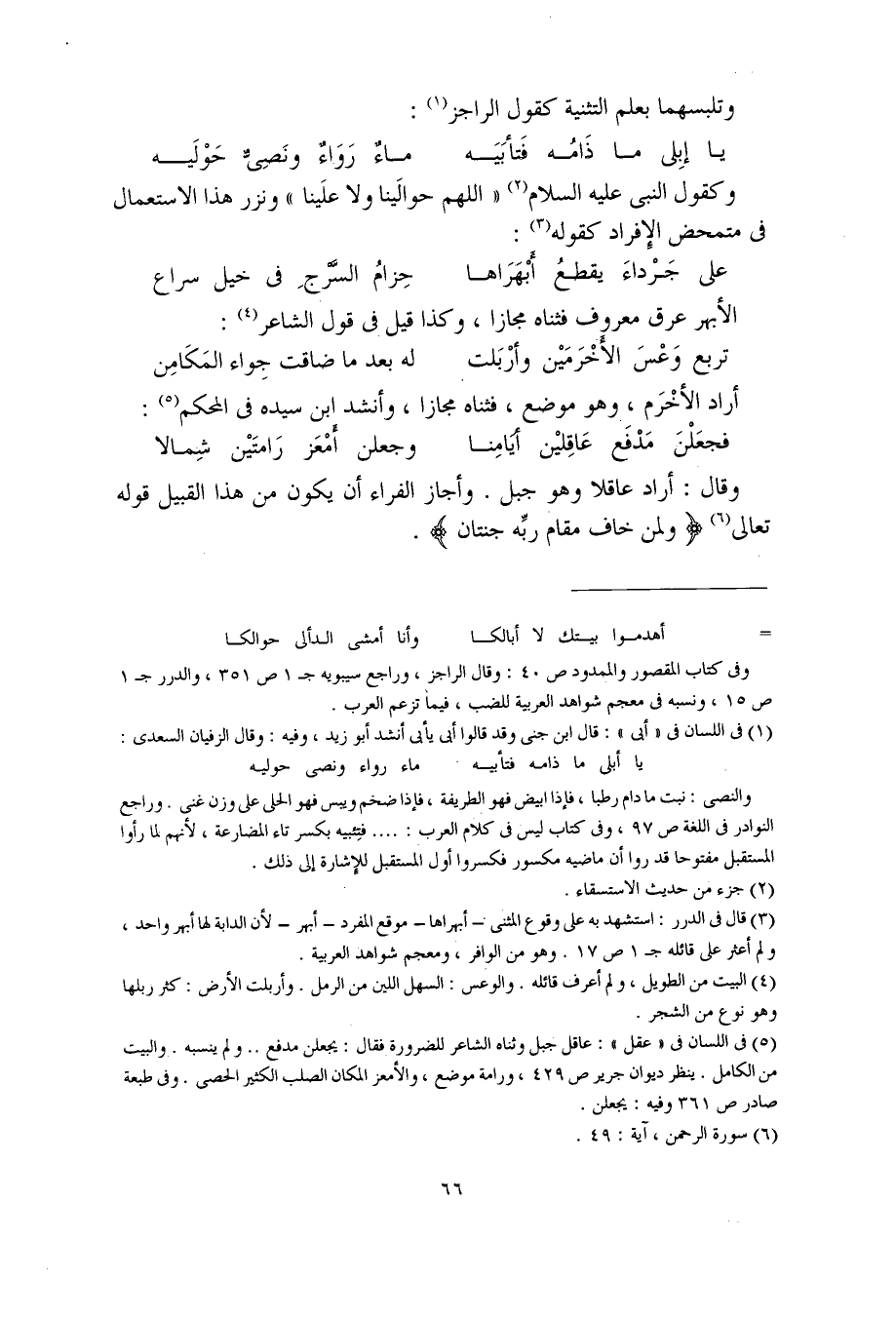 وكقول النبي عليه السلام "اللهم حوالينا ولا علينا" ونزر هذا الاستعمال في متمحض الإفراد كقوله: