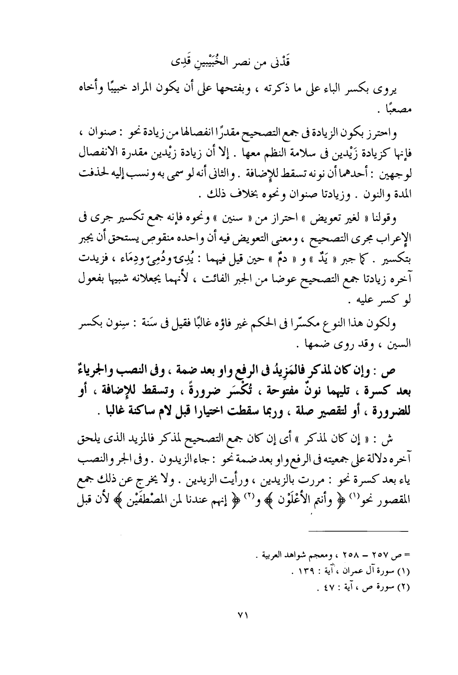 واحترز بكون الزيادة في جمع التصحيح مقدرًا انفصالها من زيادة نحو: صنوان، فإنها كزيادة زَيْدين في سلامة النظم معها، إلا أن زيادة زيدين مقدرة الانفصال لوجهين: أحدهما أن نونه تسقط للإضافة، والثاني أنه لو سمي به ونسب إليه لحذفت المدة والنون، وزيادتا صنوان ونحوه بخلاف ذلك.