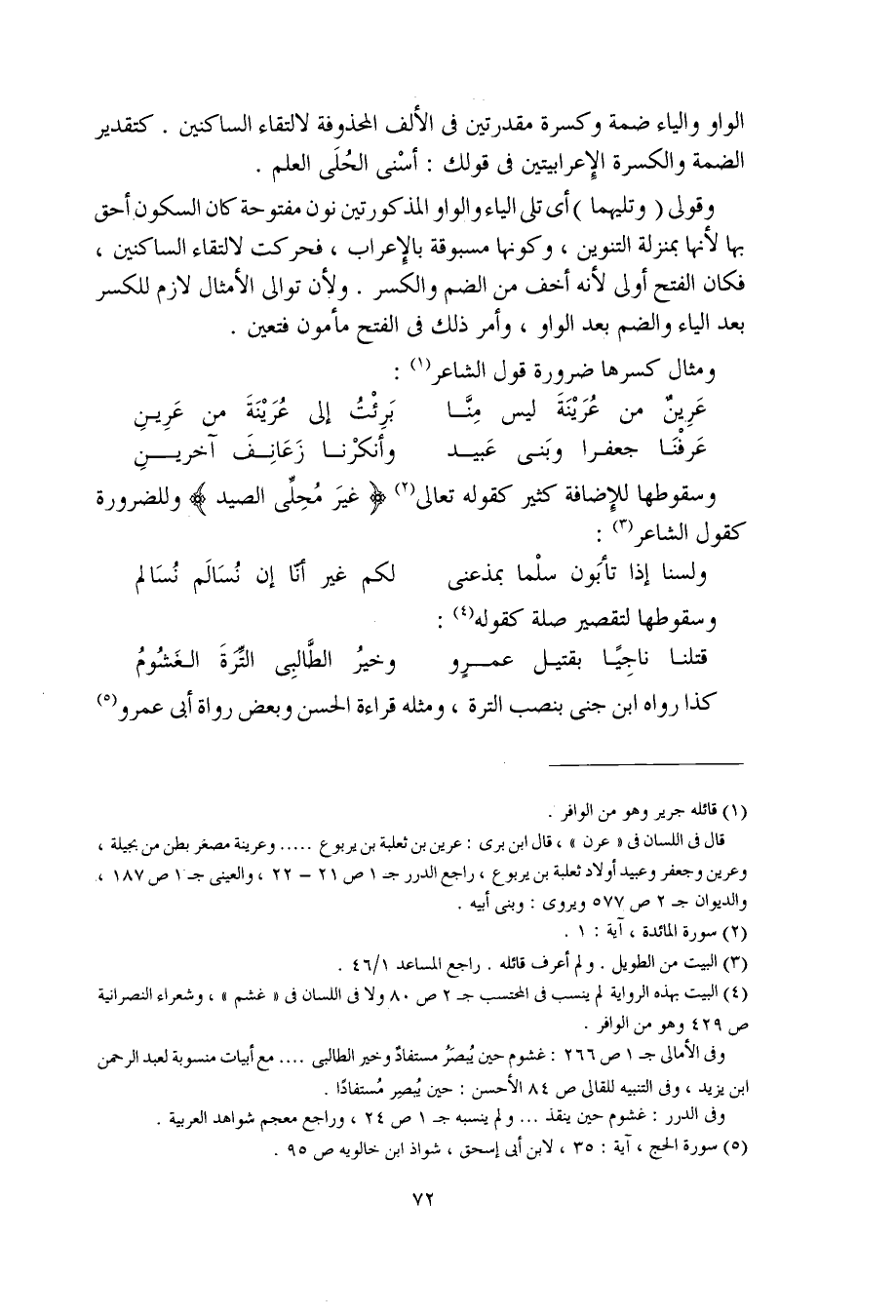 وسقوطها للإضافة كثير كقوله تعالى (غيرَ مُحِلِّي الصيد) وللضرورة كقول الشاعر: