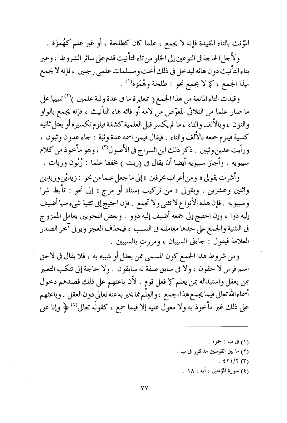 ومن شروط هذا الجمع كون المسمى ممن يعقل أو شبيه به، فلا يقال في لاحق اسم فرس لاحقون، ولا في سابق صفة له سابقون، ولا حاجة إلى تنكب التعبير بمن يعقل واستبداله بمن يعلم كما فعل قوم، لأن باعثهم على ذلك قصدهم دخول أسماء الله تعالى فيما يجمع هذا الجمع، والعِلْم مما يخبر به عنه تعالى دون العقل، وباعثهم على ذلك غير مأخوذ به ولا معول عليه إلا فيما سمع، كقول تعالى (وإنا على