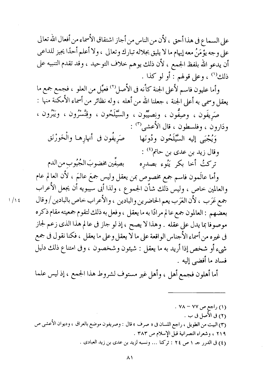 وأما عليون فاسم لأعلى الجنة كأنه في الأصل فعيِّل من العلو، فجمع جمع ما يعقل وسمى به أعلى الجنة، جعلنا الله من أهله، وله نظائر من أسماء الأمكنة منها: صَرِفَون، وصِفُّون، ونِصِّيبُون، والسَّيْلَحُون، وقِنَّسْرُون، ويَبْرُون، ودارون، وفلسطون، قال الأعشى: