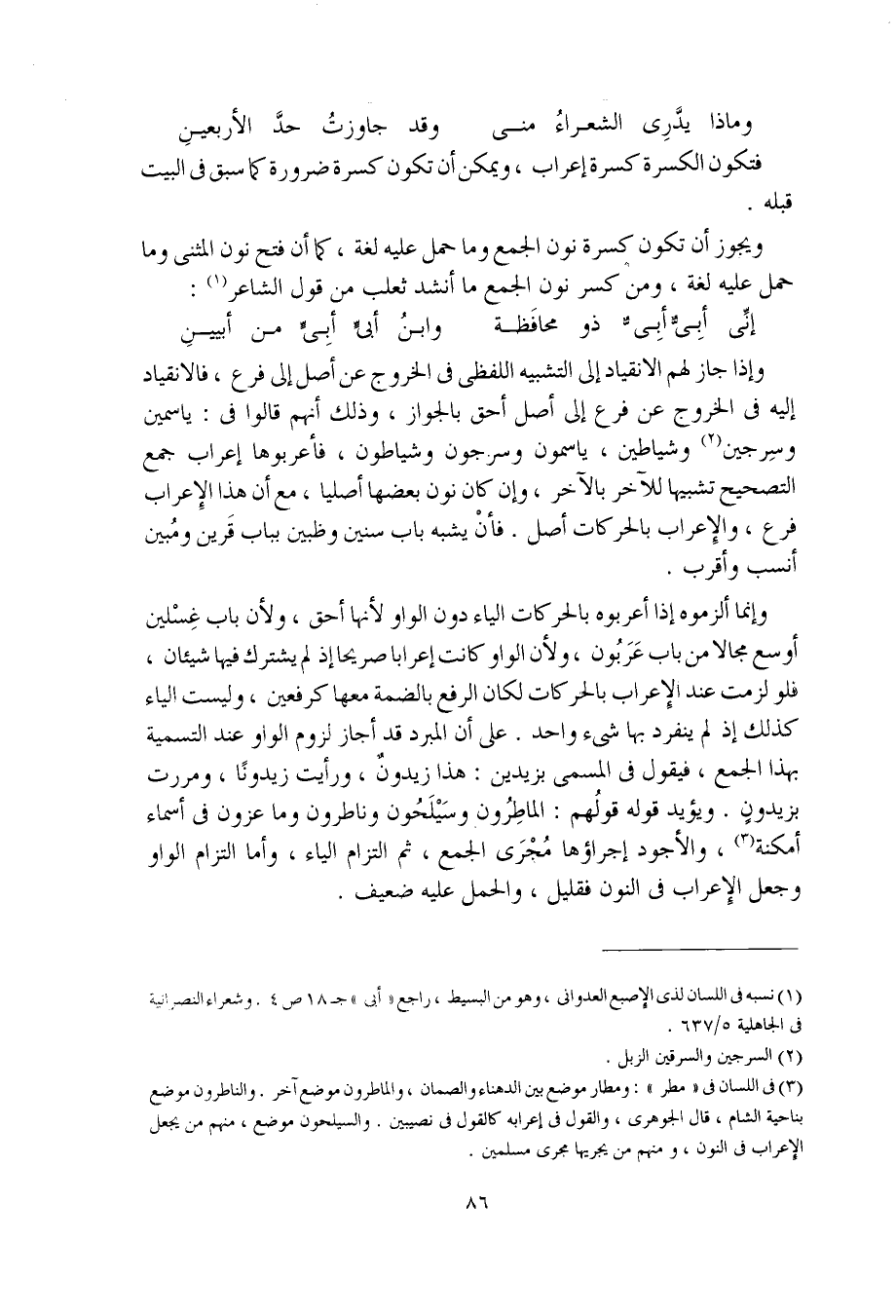 وإنما ألزموه إذا أعربوه بالحركات الياء دون الواو لأنها أحق، ولأن باب غِسْلين أوسع مجالا من باب عَرَبُون، ولأن الواو كانت إعرابا صريحا إذ لم يشترك فيها شيئان، فلو لزمت عند الإعراب بالحركات لكان الرفع بالضمة معها كرفعين، وليست الياء كذلك إذ لم ينفرد بها شيء واحد. على أن المبرد قد أجاز لزوم الواو عند التسمية بهذا الجمع، فيقول في المسمى بزيدين: هذا زيدونٌ، ورأيت زيدونًا، ومررت بزيدونٍ. ويؤيد قوله قولُهم: الماطِرُون وسَيْلَحُون وناطرون وماعزون في أسماء أمكنة، والأجود إجراؤها مُجْرَى الجمع، ثم التزام الياء، وأما التزام الواو وجعل الإعراب في النون فقليل، والحمل عليه ضعيف.