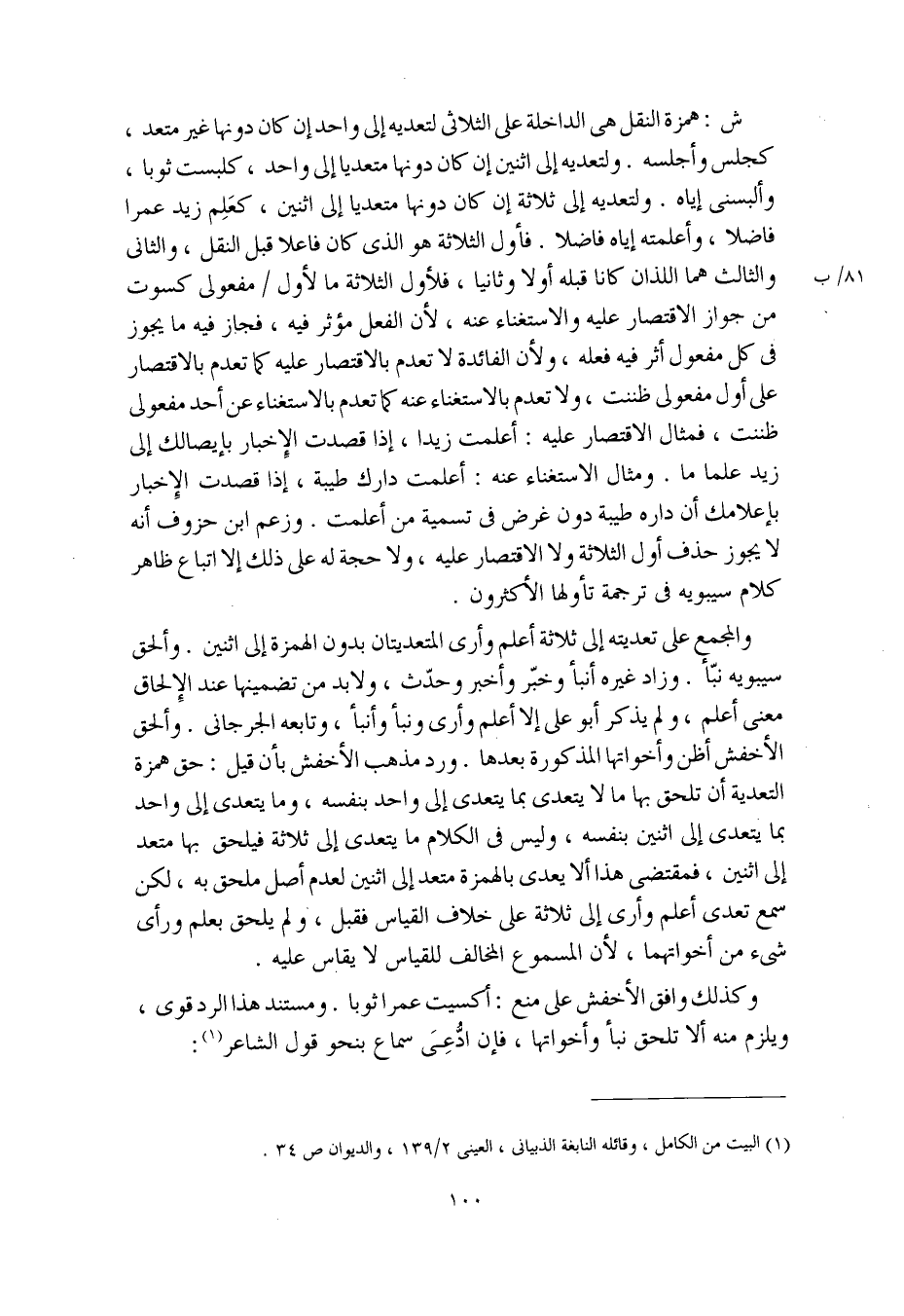 وكذلك وافق الأخفش على منع: أكسيت عمرا ثوبا، ومستند هذا الرد قوي، ويلزم منه ألا تلحق نبأ وأخواتها، فإن ادُّعِيَ سماع بنحو قول الشاعر: