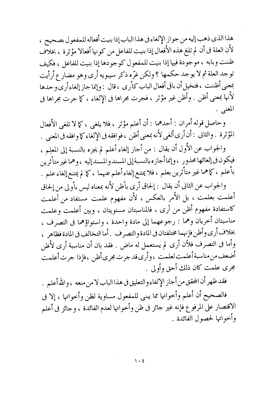 والجواب عن الثاني أن يقال: إلحاق أرى بأظن لأنه بمعناه ليس بأولى من إلحاق أعلمت بعلمت، بل الأمر بالعكس، لأن مفهوم علمت مستفاد من أعلمت كاستفادة مفهوم أظن من أرى، فالمناسبتان مستويتان، وبين أعلمت وعلمت مناسبتان أخريان وهما: رجوعهما إلى مادة واحدة، واستواؤهما في التصرف، بخلاف أرى وأظن فإنهما مختلفتان في المادة والتصرف. أما التخالف في المادة فظاهر، وأما في التصرف فلأن أرى لم يستعمل له ماض. فقد بان أن مناسبة أرى لأظن أضعف من مناسبة أعلمت لعلمت، وأرى قد جرت مجرى أظن، فإذا جرت أعلمت مجرى عملت كان ذلك أحق وأولى.