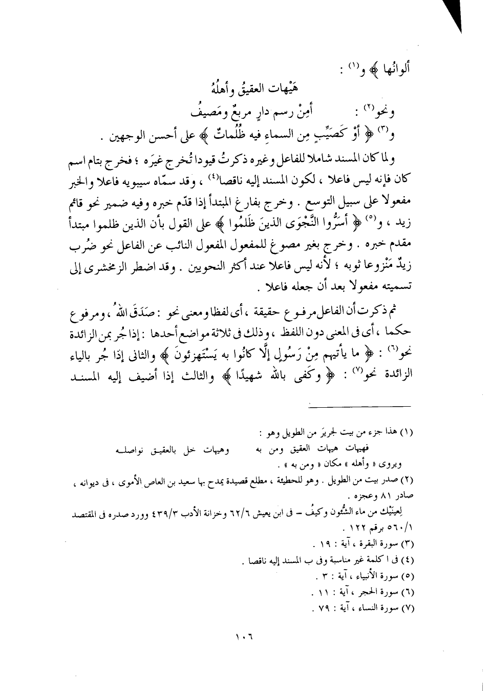 ولما كان المسند شاملا للفاعل وغيره ذكرتُ قيودا تُخرج غيرَه؛ فخرج بتام اسم كان فإنه ليس فاعلا، لكون المسند إليه ناقصا، وقد سمّاه سيبويه فاعلا والخبر مفعولا على سبيل التوسع. وخرج بفارغ المبتدأ إذا قدّم خبره وفيه ضمير نحو قائم زيد، و (أسَرُّوا النجوى الذين ظلموا) على القول بأن الذين ظلموا مبتدأ مقدم خبره. وخرج بغير مصوغ للمفعول المفعول النائب عن الفاعل نحو ضُرب زيدٌ مَنْزوعا ثوبه؛ لأنه ليس فاعلا عند أكثر النحويين. وقد اضطر الزمخشري إلى تسميته مفعولا بعد أن جعله فاعلا.