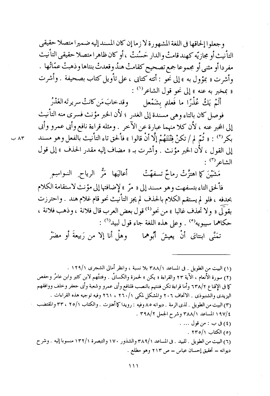 وأشرت "بمؤول به" إلى نحو: أتته كتابي، على تأويل كتاب بصحيفة. وأشرت "بمخبر به عنه" إلى نحو قول الشاعر: