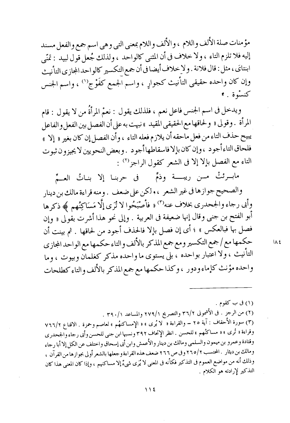 والصحيح جوازها في غير الشعر، ولكن على ضعف. ومنه قراءة مالك بن دينار وأبي رجاء والجحدري بخلاف عنه "فأصبحوا لا تُرى إلا مساكنُهم" ذكرها أبو الفتح بن جني وقال إنها ضعيفة في العربية. وإلى نحو هذا أشرت بقولي "وإن فصل بها فبالعكس"، أي إن فصل بإلا فالحذف أجود من لحاقها. ثم بينت أن حكمها مع جمع التكسير ومع جمع المذكر بالألف والتاء حكمها مع الواحد المجازي التأنيث، ولا اعتبار بواحده، بلى يستوي ما واحده مذكر كغلمان وبيوت، وما واحده مؤنث كإماء ودور، وكذا حكمها مع جمع المذكر بالألف والتاء كطلحات