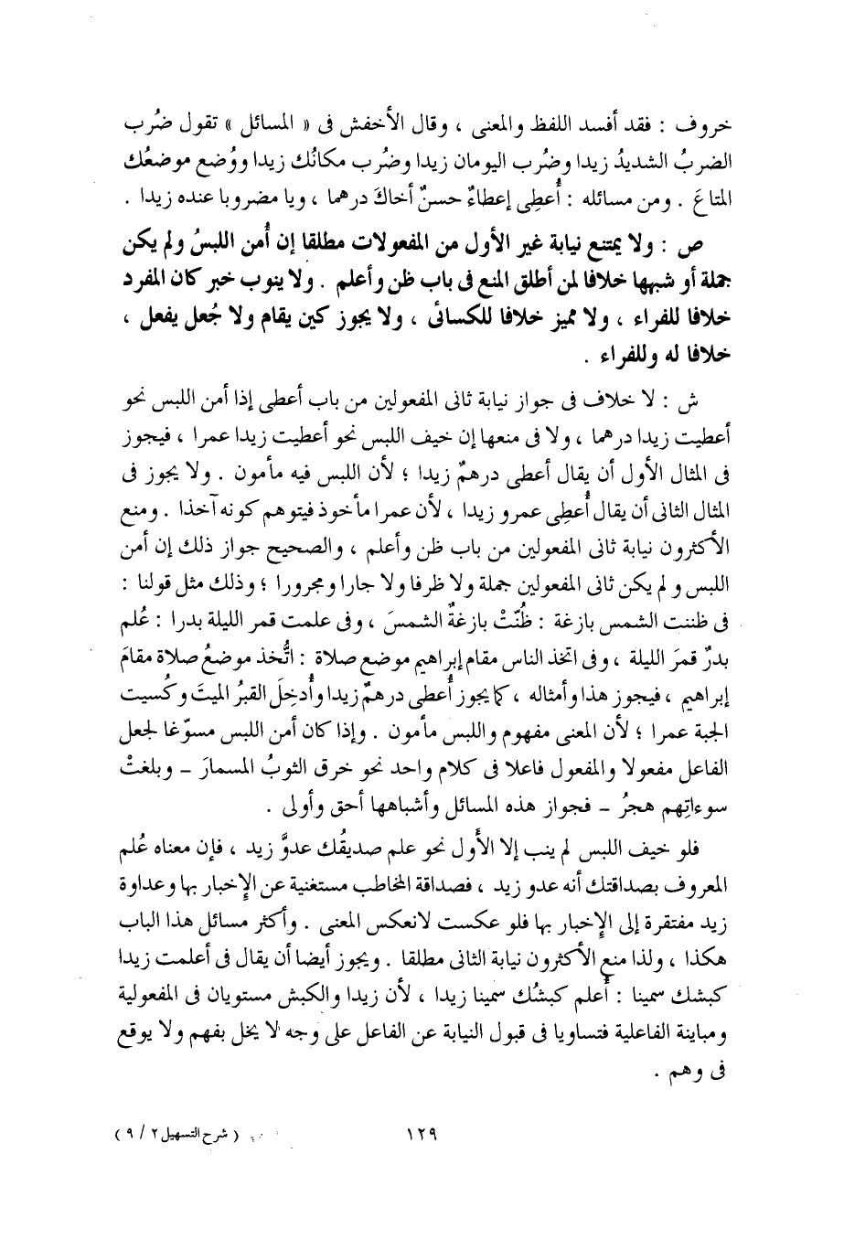 ش: لا خلاف في جواز نيابة ثاني المفعولين من باب أعطى إذا أمن اللبس نحو أعطيت زيدا درهما، ولا في منعها إن خيف اللبس نحو أعطيت زيدا عمرا، فيجوز في المثال الأول أن يقال أعطى درهمٌ زيدا، لأن اللبس فيه مأمون. ولا يجوز في المثال الثاني أن يقال أُعطِي عمروا زيدا، لأن عمرا مأخوذ فيتوهم كونه آخذا. ومنع الأكثرون نيابة ثاني المفعولين جملة ولا ظرفا ولا جارا ومجرورا، وذلك مثل قولنا: في ظننت الشمس بازغة: ظُنّتْ بازغةٌ الشمسَ، وفي علمت قمر الليلة بدرا: عُلم بدرٌ قمرَ الليلة، وفي اتخذ الناس مقام إبراهيم موضع صلاة: اتُّخذ موضعُ صلاة مقامَ إبراهيم، فيجوز هذا وأمثاله، كما يجوز أُعطي درهمٌ زيدا وأُدخِلَ القبرُ الميتَ وكُسيت الجبة عمرا، لأن المعنى مفهوم واللبس مأمون. وإذا كان أمن اللبس مسوّغا لجعل الفاعل مفعولا والمفعول فاعلا في كلام واحد نحو خرق الثوبُ المسمارَ - وبلغتْ سوءاتِهم هجرُ - فجواز هذه المسائل وأشباهها أحق وأولى.