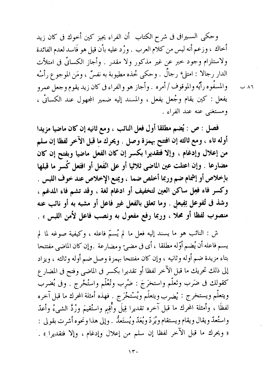 ش: النائب هو ما يسند إليه فعل ما لم يُسمّ فاعله، وكيفية صوغه لما لم يسم فاعله أن يُضم أوّله مطلقا، أي في مضيّ ومضارعة. وإن كان الماضي مفتتحا بتاء مزيدة ضم أوله وثانيه، وإن كان مفتتحا بهمزة وصل ضم أوله وثالثه، ويزاد إلى ذلك تحريك ما قبل الآخر لفظا أو تقديرا بكسر في الماضي وفتح في المضارع كقولك في ضَرب وتَعلّم واستخرَجَ: ضُرِب وتُعُلّم واستُخْرج. وفي يُضرب ويتعلّم ويستخرج: يُضرب ويتعلّم ويُسْتخرَج. فهذه أمثلة المحرك ما قبل آخره لفظا، وأمثلة المحرك ما قبل آخره تقديرا قيلَ وأُقيم واستُقيم ورُدَّ الشيءُ وأعدّ واستُعدّ ويقال ويقام ويستقام ويُرَدّ ويُعَدّ ويُستَعدُّ. وإلى هذا ونحوه أشرت بقولي: "ويحرك ما قبل الآخر لفظا إن سلم من إعلال وإدغام، وإلا فتقديرا".