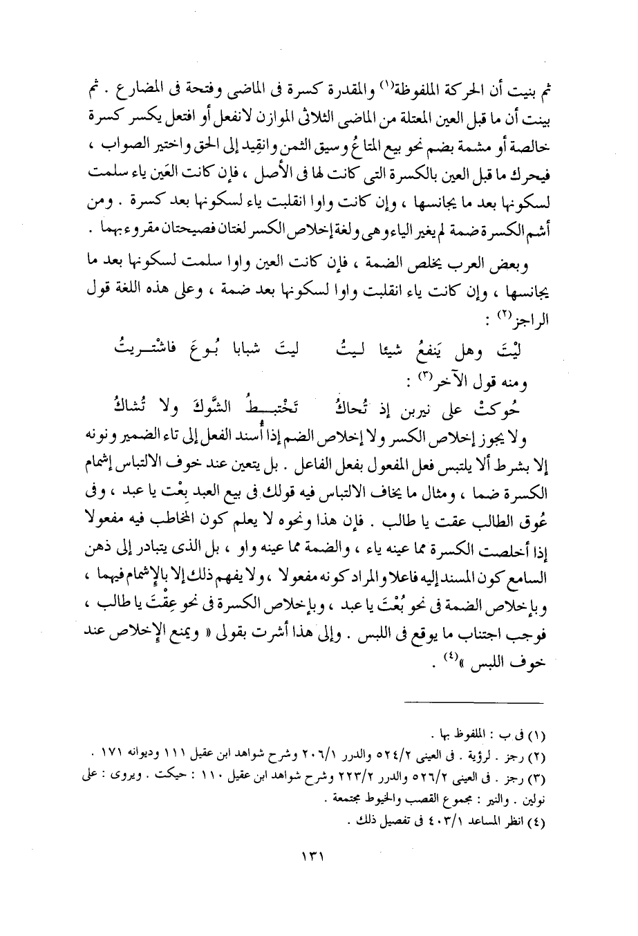 ولا يجوز إخلاص الكسر ولا إخلاص الضم إذا أُسند الفعل إلى تاء الضمير ونونه إلا بشرط ألا يلتبس فعل المفعول بفعل الفاعل. بل يتعين عند خوف الالتباس إشمام الكسرة ضما، ومثال ما يخاف الالتباس فيه قولك في بيع العبد بِعْت يا عبد، وفي عُوق الطالب عقت يا طالب. فإن هذا ونحوه لا يعلم كون المخاطب فيه مفعولا إذا أخلصت الكسرة مما عينه ياء، والضمة مما عينه واو، بل الذي يتبادر إلى ذهن السامع كون المسند إليه فاعلا والمراد كونه مفعولا، ولا يفهم ذلك إلا بالإشمام فيهما وبإخلاص الضمة في نحو بُعْتَ يا عبد، وبإخلاص الكسرة في نحو عِقْتَ يا طالب، فوجب اجتناب ما يوقع في اللبس. وإلى هذا أشرت بقولي "ويمنع الإخلاص عند خوف اللبس".